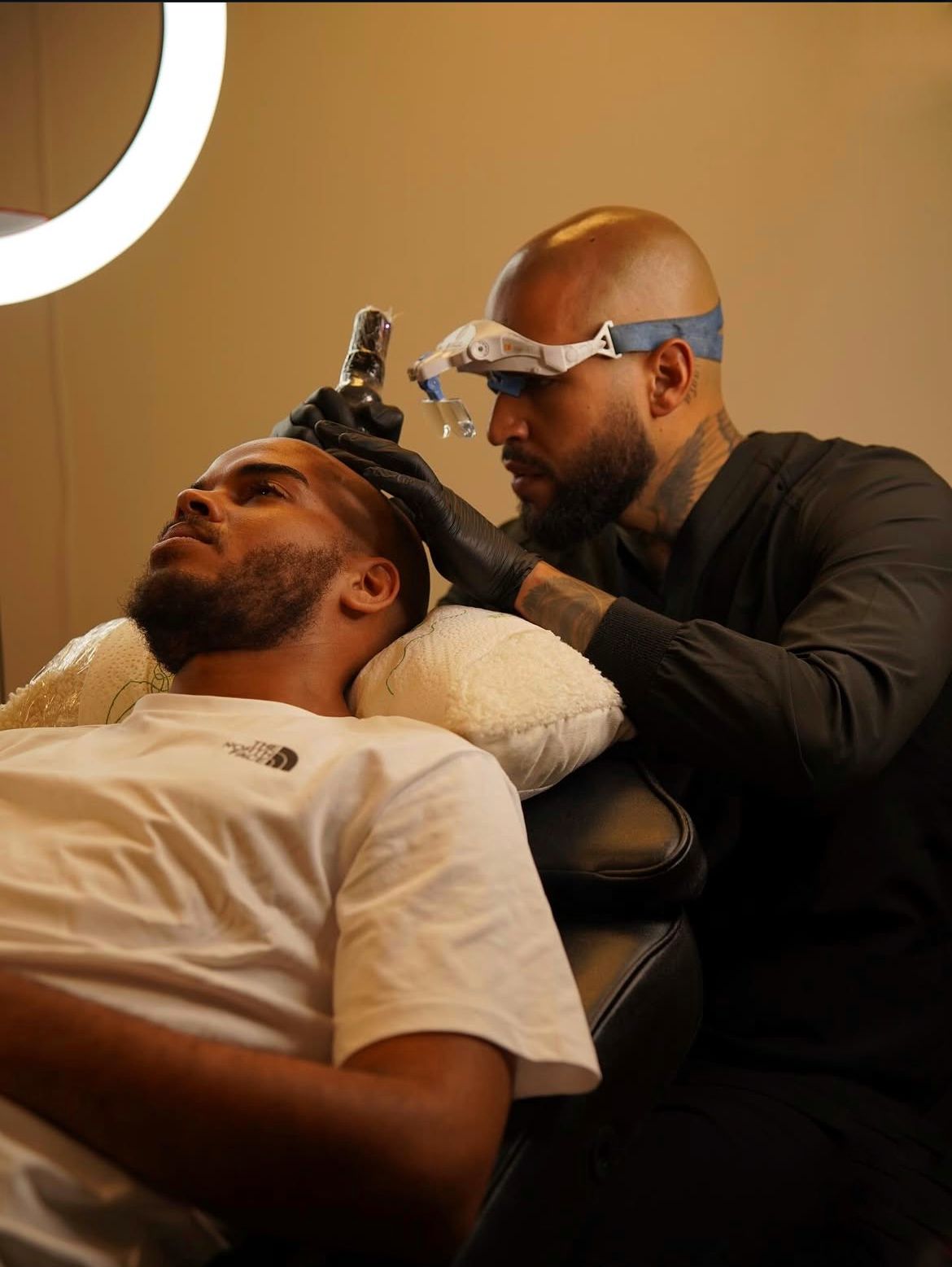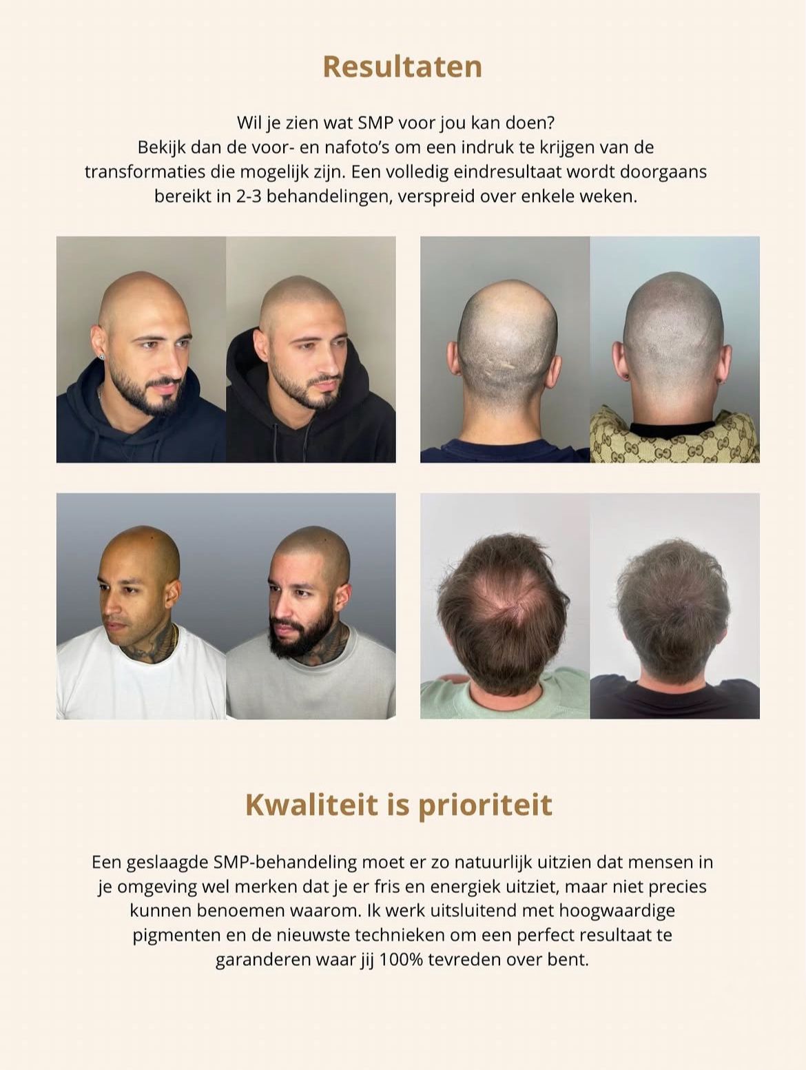 SMP is een geavanceerde pigmentatietechniek waarbij kleine micro-dots in de hoofdhuid worden geplaatst, waardoor het lijkt alsof er natuurlijke haarstoppels groeien.